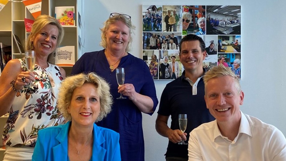 Op de foto zitten Femke Aarts (raad van bestuur Surplus) en Peter Paul Wiegmans (algemeen directeur Hago Zorg) aan tafel. Achter Femke zijn (van links naar rechts) Ingrid Boschman (regiomanager Intramurale zorg en tevens verantwoordelijk voor Facilitaire zaken bij Surplus), Vivianne Zeestraten (zorgcategoriemanager ouderenzorg bij Hago Zorg) en Tjerk Hoppenbrouwers (manager Vastgoed en Facilities bij Surplus) te zien.